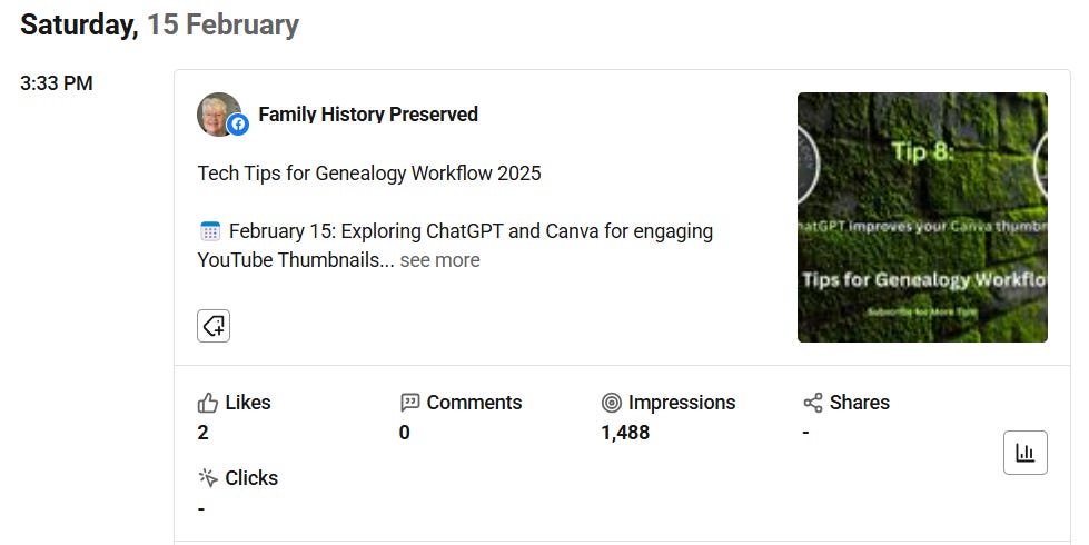 The final task was to promote these video tutorials on Buffer to send out to my social media sites, Facebook, LinkedIn and BlueSky. (Note: my free version of Buffer only permits three channels.) Buffer is a useful little tool and really simple to use. Buffer provides some analytics for your sent promotions; like the one below for Tip 8.